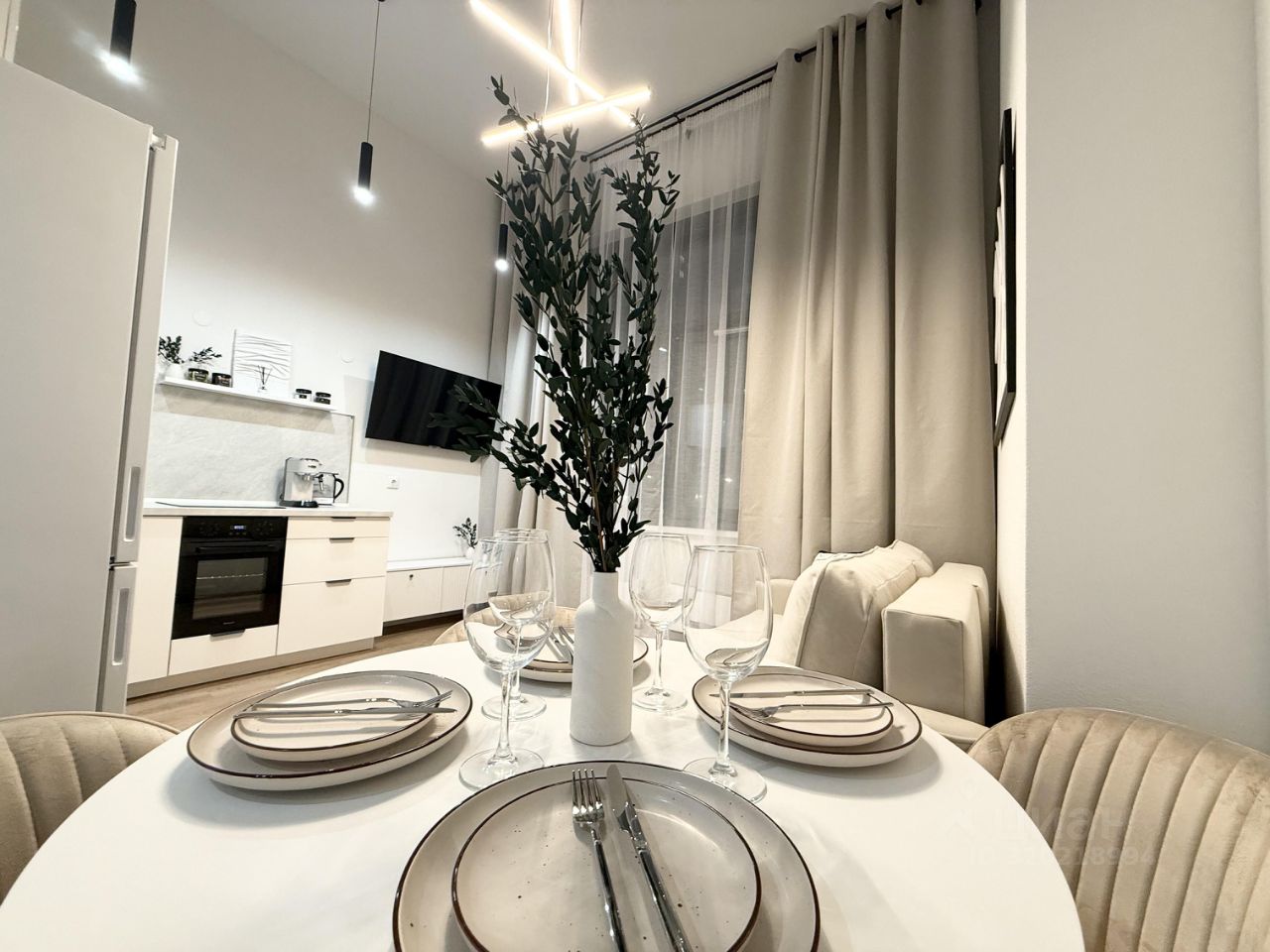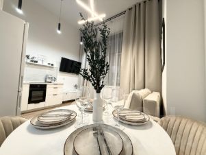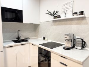 Максимально оборудованная кухня с индукционной плитой, духовым шкафом, вместительным двухкамерным холодильником, микроволновой печью, посудомоечной машиной, кофемашиной, электрическим чайником и полным набором посуды.