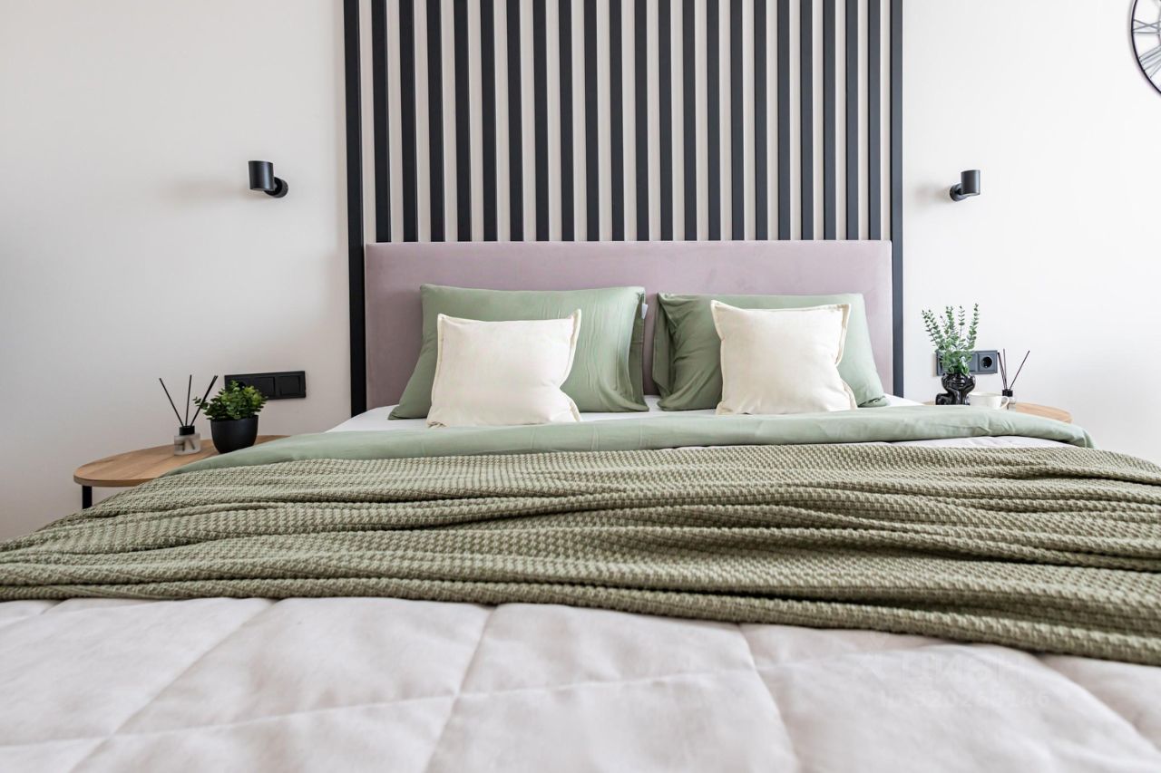 Уютная спальная зона с двуспальной кроватью, чистым постельным бельем, кондиционером, бесплатным Wi-fi и смарт ТВ