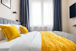 Уютная спальная зона с двуспальной кроватью, чистым постельным бельем, кондиционером, бесплатным Wi-fi и смарт ТВ
