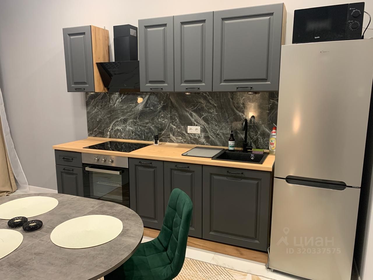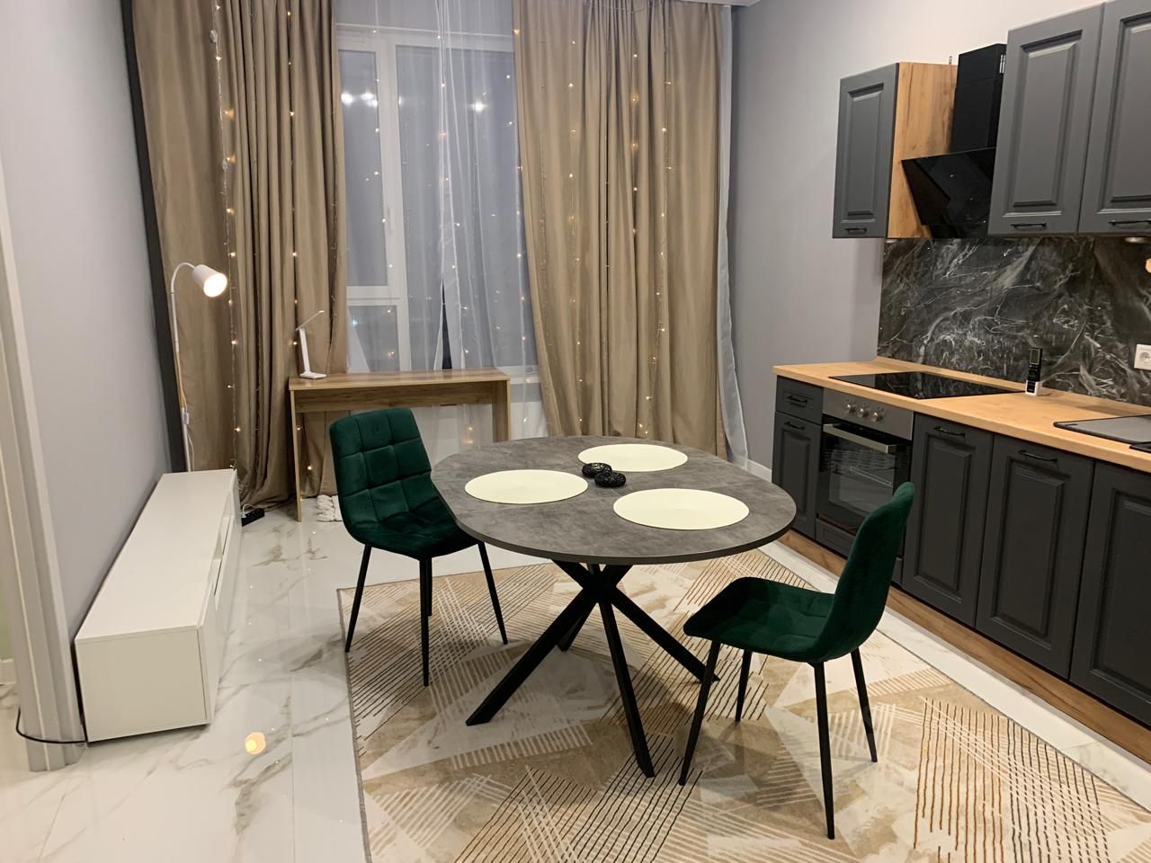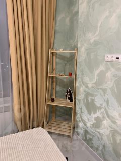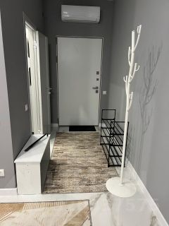 Квартира оборудована всей необходимой мебелью и бытовой техникой. В прихожей кондиционер. На кухне встроенный гарнитур с варочной панелью, духовкой, вытяжкой, холодильником и СВЧ печью, раздвижной стол, стулья. В комнате 2-сп. кровать с мягким изголовьем и 2-мя тумбочками, большой зеркальный шкаф-купе для одежды. Санузел оборудован душевой кабиной и стиральной машиной.