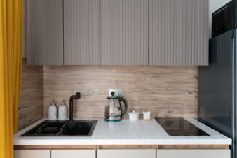 Современная кухня с электроплитой и всей необходимой утварью для приготовления вкусных блюд.