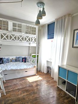 Детская спальня с кроватью в ТРИ яруса (нижняя выдвижная секция с матрасом), гардеробная, шведская стенка с турником;