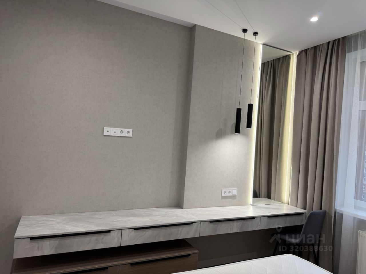 В спальне имеется шикарная кровать с ортопедическим матрасом и подьемным механизмом, рабочая зона и шикарный встроенный шкаф, куда поместиться весь ваш гардероб.