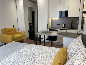 - Полностью оборудованные апартаменты включают всё необходимое для комфортной жизни: бытовую технику, мебель, средства личной гигиены и высокоскоростной Интернет.