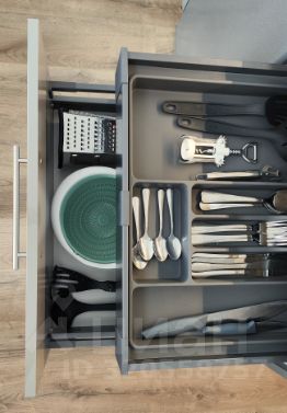 Кухонная зона: кухонный гарнитур, электрическая плита, холодильник, микроволновая печь, посуда и приборы на 3 персоны, электрический чайник, кастрюли, сковорода, средства для мытья посуды.