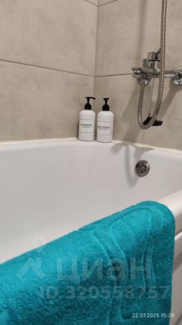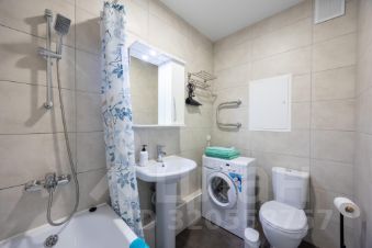 Санузел: ванна, стиральная машина, унитаз, раковина, зеркальный навесной шкаф, фен, шампунь, гель для душа, мыло.