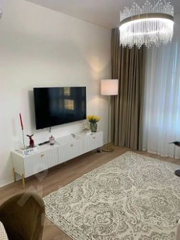 Здесь есть все необходимое: современная мебель на кухне и в комнате, качественная бытовая техника — кондиционер, холодильник, посудомоечная и стиральная машины, телевизор. Просторная ванная комната оборудована ванной.