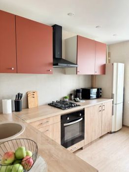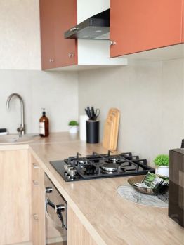 — Полноценная кухня: плита, микроволновка, холодильник, набор посуды, кофе, чай, конфеты и базовые специи уже ждут