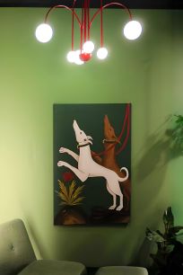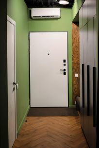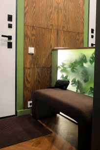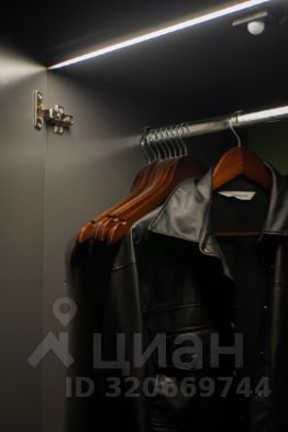 23-й этаж, панорамное окно. Днём здесь много естественного света, вечером видно красивые закаты, и студия превращается в уютное пространство с разными сценариями освещения — в комнате 9 источников света. На кухне вместо привычных верхних шкафов — арка с полками из натурального дуба, чтобы кухня не доминировала, а органично вписывалась в интерьер.