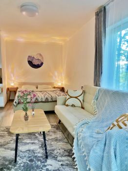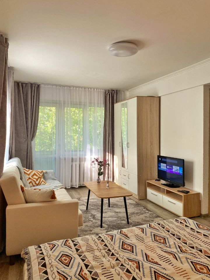Квартира очень светлая и уютная, с балконом. В просторной комнате легко разместились двуспальная кровать с ортопедическим матрасом и красивый раскладной диван. Новая мебель и техника: шкаф с зеркалом, Smart TV, холодильник, стиральная машина, микроволновка. Кухня IKEA, вся необходимая посуда уже есть — можно заехать с одним чемоданом. Горячая вода от газовой колонки — перебоев не бывает.
