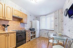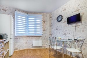 Кухня: ТВ 26", обеденный стол, стулья, СВЧ, холодильник, капсульная кофемашина, эл. чайник, фильтр для воды, эл. плита, посуда, столовые приборы, чай, кофе, сахар.