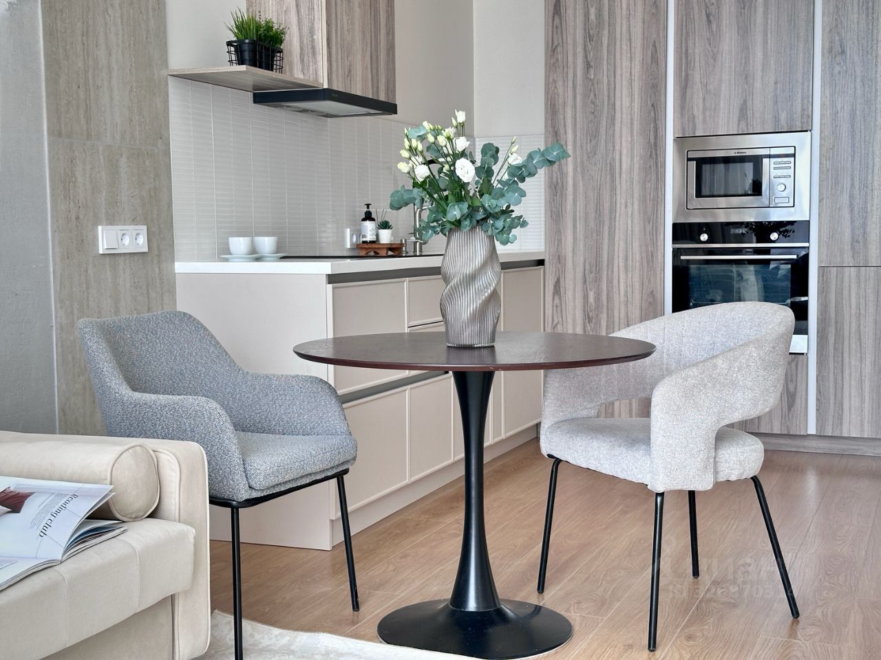 Общая площадь квартиры составляет 45 квадратных метров, из которых 20 квадратных метров занимает кухня. Высокие потолки в 3.8 метра дарят ощущение простора и света. квартира будто наполнена светом.
