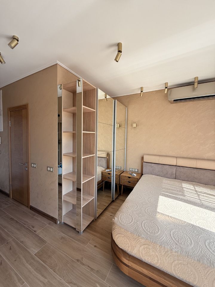 В квартире выполнен дизайнерский ремонт, установлены кондиционер, телевизор, холодильник, СВЧ посудомоечная и стиральная машины премиальных марок. Санузел совмещённый, оборудован чугунной ванной, что редкость в современных студиях. Полноценная кровать, с ортопедическим матрасом Орто премиум. Интернет видеодомофон.