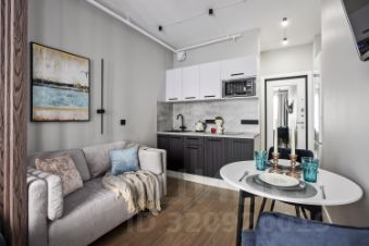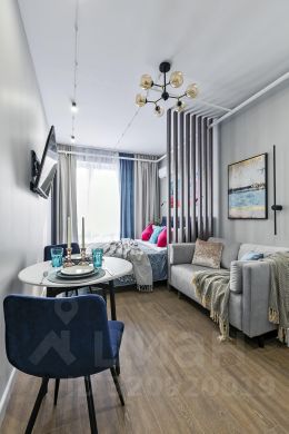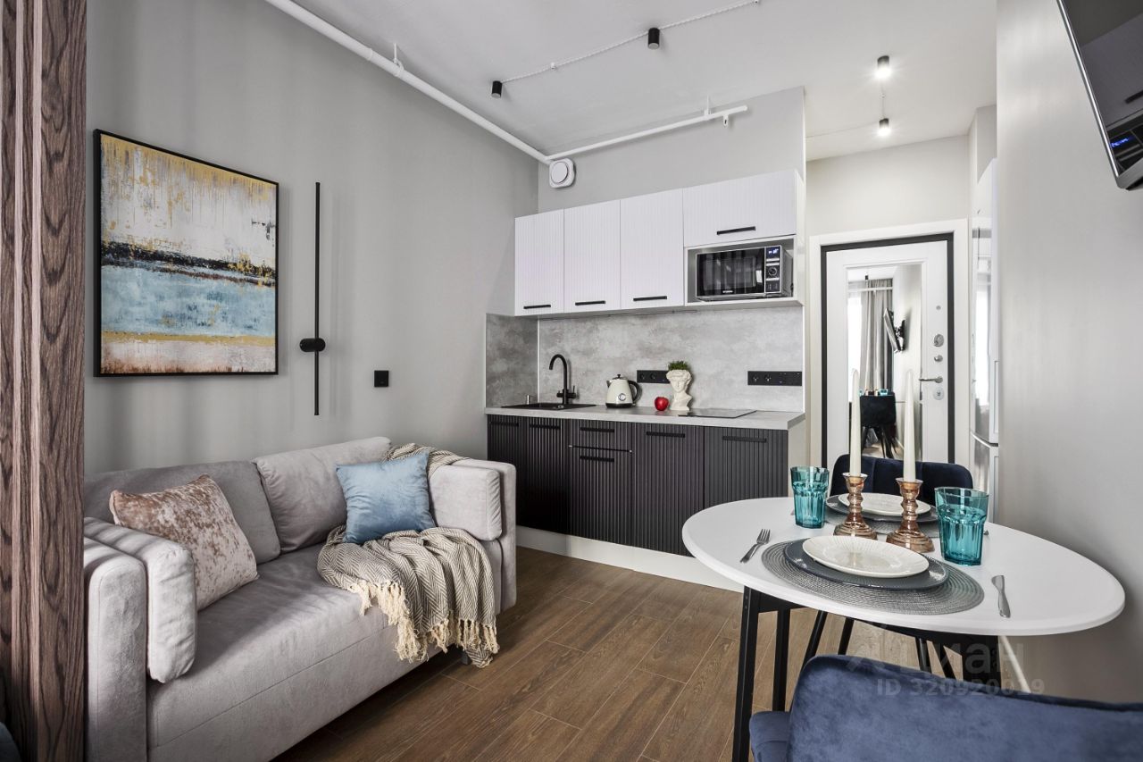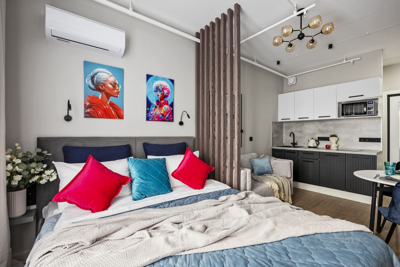 В апартаментах выполнен дизайнерский ремонт. Вся необходимая мебель уже есть: на кухне и в комнате. Установлена современная техника: кондиционер, холодильник, телевизор и стиральная машина. В совмещённом санузле оборудована душевая кабина. Окна выходят на улицу, что обеспечивает естественное освещение и вид на город.