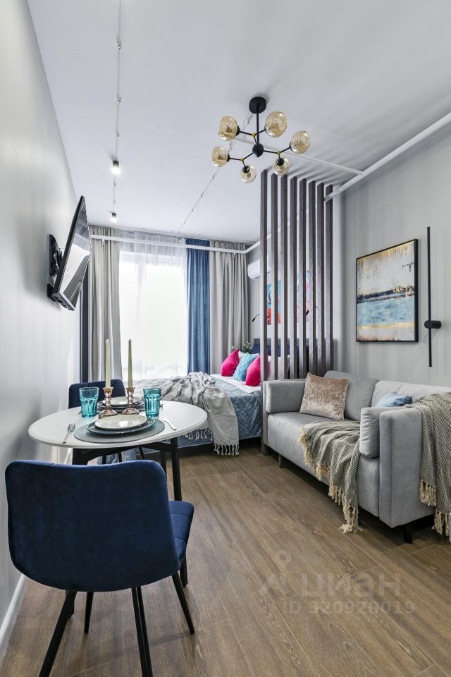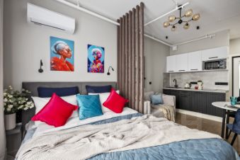 Предлагаем в аренду стильные апартаменты-студию в Москве на 1-й Магистральной улице, 25. Общая площадь составляет 22 кв. м, жилая площадь — 16 кв. м. Апартаменты находятся на 11 этаже 23-этажного дома. Высокие потолки создают ощущение простора. До станции метро "Хорошёвская" всего 8 минут пешком.