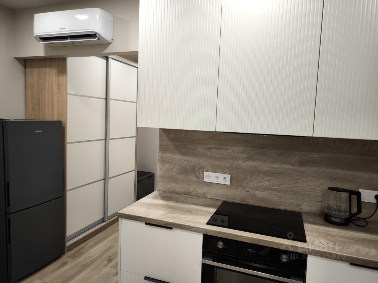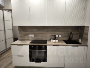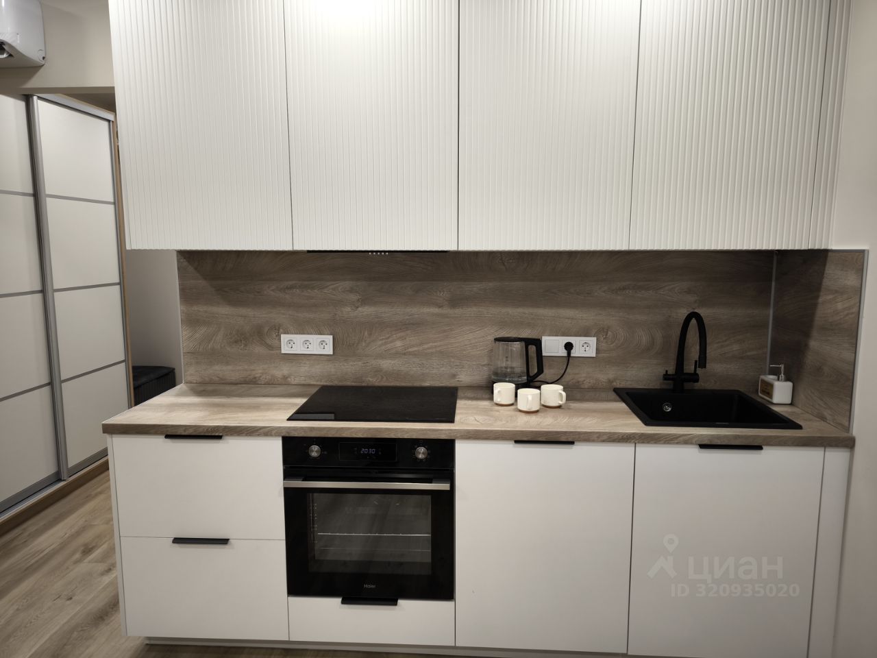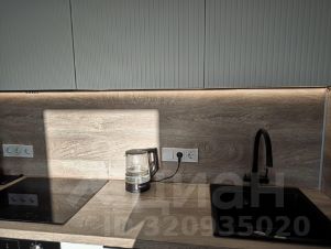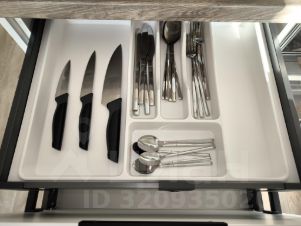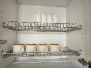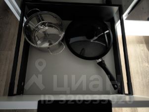 - Кухонный гарнитур со встроенной бытовой техникой: варочная панель, вытяжка, духовой шкаф, посудомоечная машина. Имеются наборы посуды для приготовления и приёма пищи, обеденный стол и два стула.