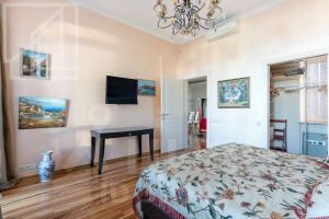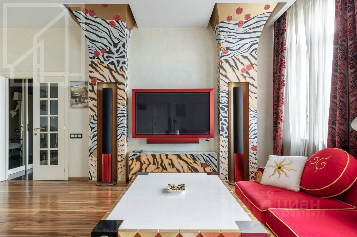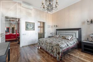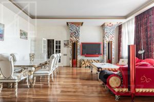 Планировка включает кухню, 1 спальню, гостиную, кабинет, санузел. Есть гардеробная и балкон. Потолки 4 м Ремонт в квартире выполнен в уникальном авторском стиле.
