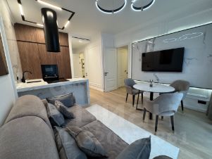 Кухня оборудована по последнему слову техники: помимо стильного кухонного гарнитура, индукционной плиты с мощной вытяжкой и холодильника, имеются духовой шкаф, свч и посудомоечная машина. Рядом расположена обеденная зона с столом и плазменный телевизор, диван раскладной. Установлены: теплый пол, кондиционирование (приточно-вытяжная система). В спальне шикарная двуспальная кровать с ортопедическим матрасом, 2 прикроватные тумбы, стол. Гардеробная комната вместительная с шкафами и подсветкой. Санузел с ванной оборудован качественной сантехникой Villeroy & Boch . Санузел совмещен, в ванной стеклянный экран от брызг, зеркало с удобной подсветкой, раковина для умывания, стиральная машина.
