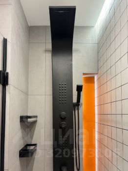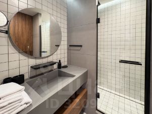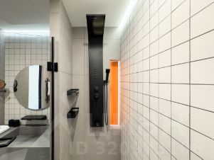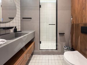 Ванная комната: оснащена душевая кабина, зеркало с подсветкой над раковиной и тумба.