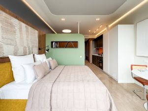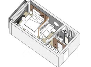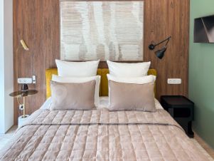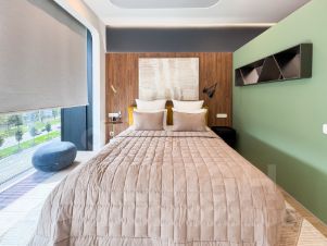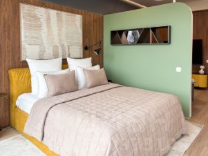 Спальная зона: оснащена двуспальный кровать, обеденный стол с двумя стульями, тумбой и пуфиком.