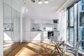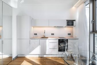 • белые глянцевые поверхности кухни и встроенных шкафов усиливают эффект света;