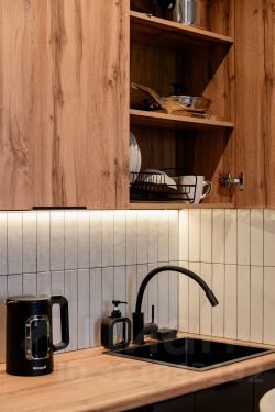 4. Полный комплект посуды на четверых, столовые приборы и всё необходимое для приготовления домашних завтраков, обедов, ужинов;
