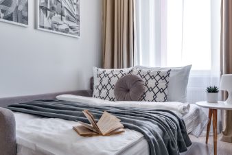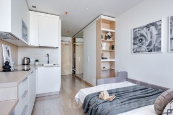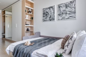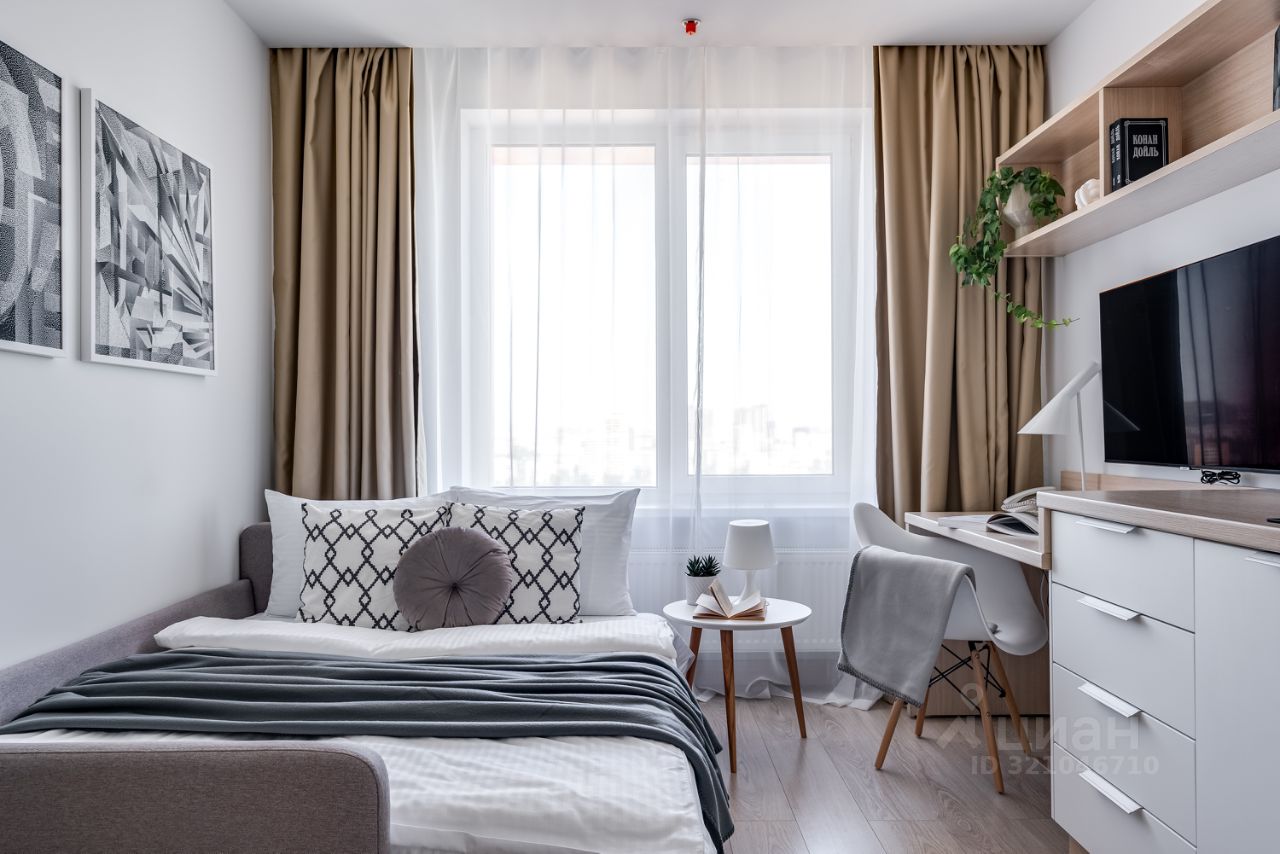 В апартаменте есть все для комфортного проживания. В зоне спальни расположен диван 140*200. В рабочей зоне есть письменный стол, лампа, кресло.