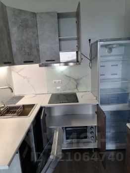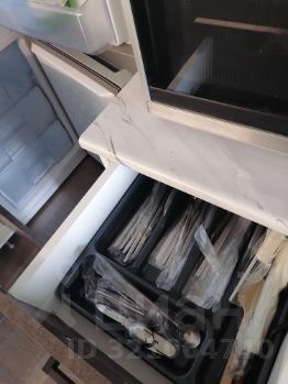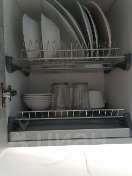 Вся техника: холодильник, варочная панель, вытяжка, мини-духовка, микроволновка, посудомоечная и стиральная машины, телевизор.