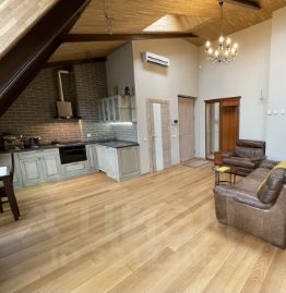 Динамичный нью-йоркский стиль: элементы декора включают кирпич, ковку, дерево, натуральный текстиль. Кухня-гостиная 30 кв/м (потолок 7 м) и одна спальня 25 кв/м (потолок 3 м). Балкон, на котором можно посидеть и выпить бокал любимого напитка. Два санузла. Гардеробная. Установлена бытовая техника, лофт полностью меблирован. Интернет, TV.