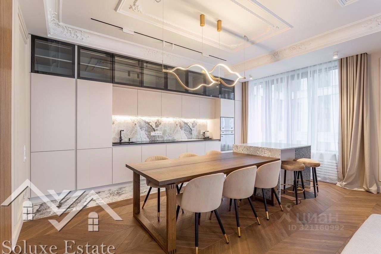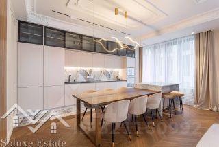 • Отделка: В квартире выполнена отделка из премиум материалов: паркет из натурального дерева, дизайнерские обои, высококачественная плитка в санузлах и на кухне. Освещение представлено стильными люстрами и точечными светильниками.
