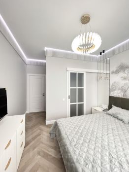 В квартире идеальная планировка : полноценная спальня, кухня-гостиная и много мест хранения вещей. Отдельная комната- спальня с гардеробной и рабочим местом. Балкон утеплен, есть кладовка и рабочее место, теплый пол. Кухня-гостиная просторная и укомплектована современной техникой: микроволновая печь, духовка, индукционная варочная панель, посудомоечная машина, встроенный холодильник. В квартире удобные и комфортные кровать и диван для отдыха. Вся мебель и техника и ремонт - все новое.