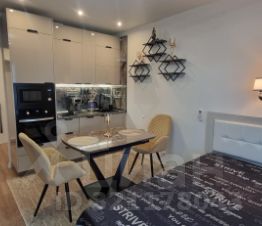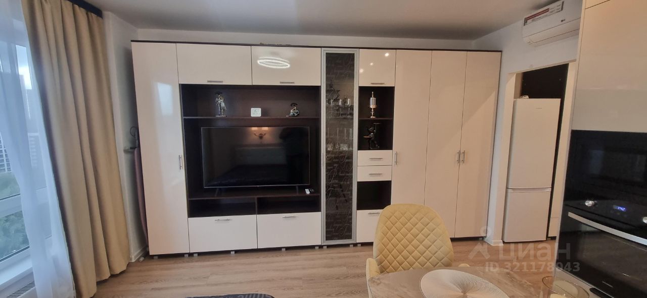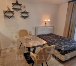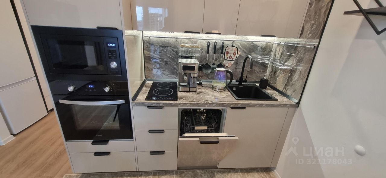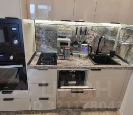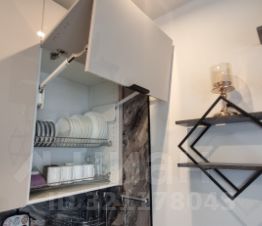 Квартира полностью готова для комфортного проживания. В студии выполнен современный ремонт, есть необходимая мебель как в комнате, так и на кухне. Ванная комната оборудована душевой кабиной. Для вашего удобства в квартире есть вся необходимая техника: кондиционер, холодильник, телевизор, плита, духовой шкаф, посудомоечная и стиральная машины, утюг, кофеварка, чайник, кухонные весы, фен.