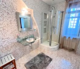 Планировка квартиры: просторный холл, гостевой сан.узел, гардеробная в холле, большая гостиная- столовая 50 кв.м. (отделена раздвижной стеклянной перегородкой от зоны кухни), кухня 15 кв.м. ( в кухню два входа из холла и гостиной), изолированная спальня 25 кв.м. с большой гардеробной и сан.узлом, где расположены ванна и душевая кабина. Выход на лоджию из спальни.