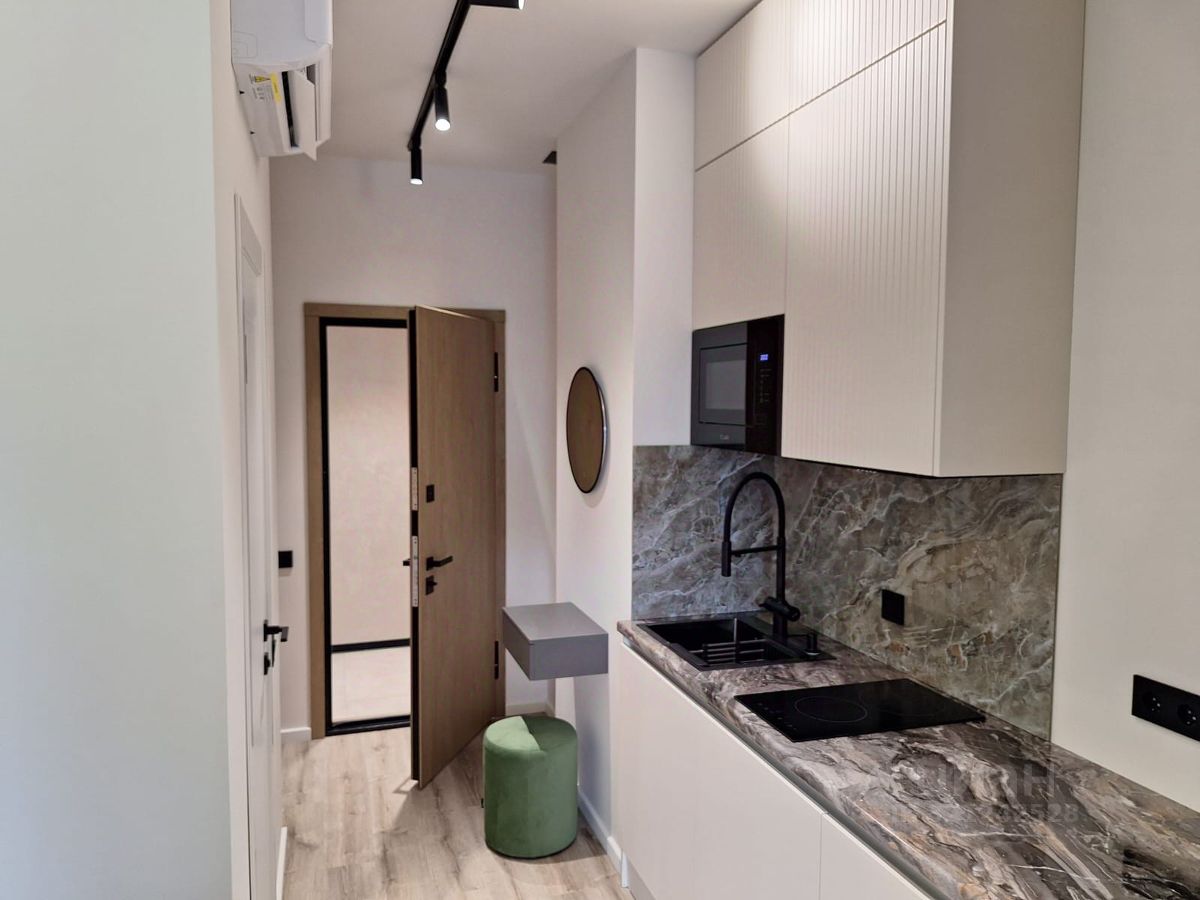 В студии выполнен дизайнерский ремонт, который подчёркивает стиль и уют. Комната оснащена всей необходимой мебелью и техникой: есть кондиционер, холодильник, телевизор и стиральная машина. Кухонная зона компактная, но функциональная, а в ванной комнате установлена современная душевая кабина. Окна выходят во двор, поэтому в квартире тихо и спокойно.
