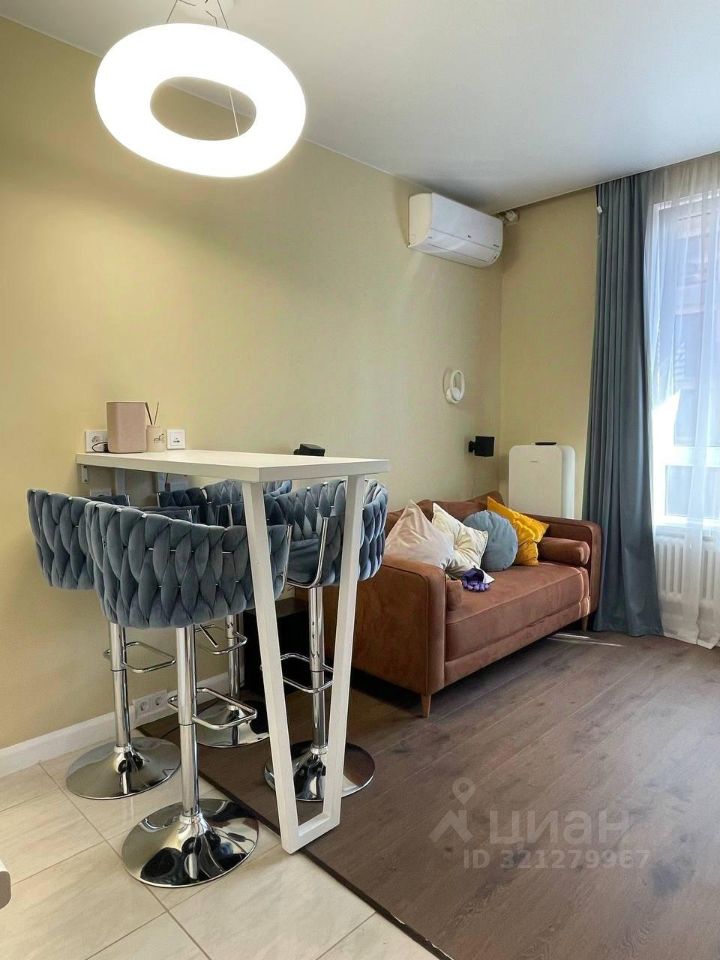 В кухонной зоне - барная стойка и 4 барных стула. Удобный раскладной диван.