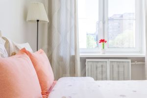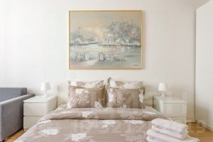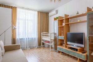 Спальные места: двуспальная кровать (200x180) и диван-кровать (190x120) в главной спальне, двуспальная кровать (200x160) в малой спальне и диван-кровать (200x140) в гостиной. В наличии есть детская кроватка и стул для кормления. Полная изоляция от шума с дороги + шторы блэкаут! Балкона нет.