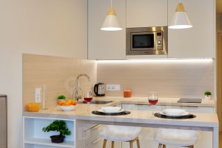 Кухонная зона: вместительный холодильник, электрическая варочная панель, вытяжка, стиральная машина, СВЧ-печь, электрический чайник, фильтр для воды, комплект посуды на 2 персоны, посуда для готовки.