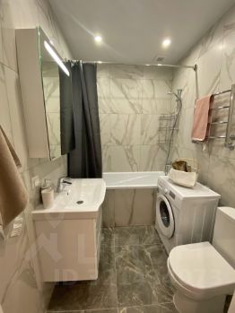 Совмещённый санузел с комфортной ванной, раковиной и зеркалом с подсветкой