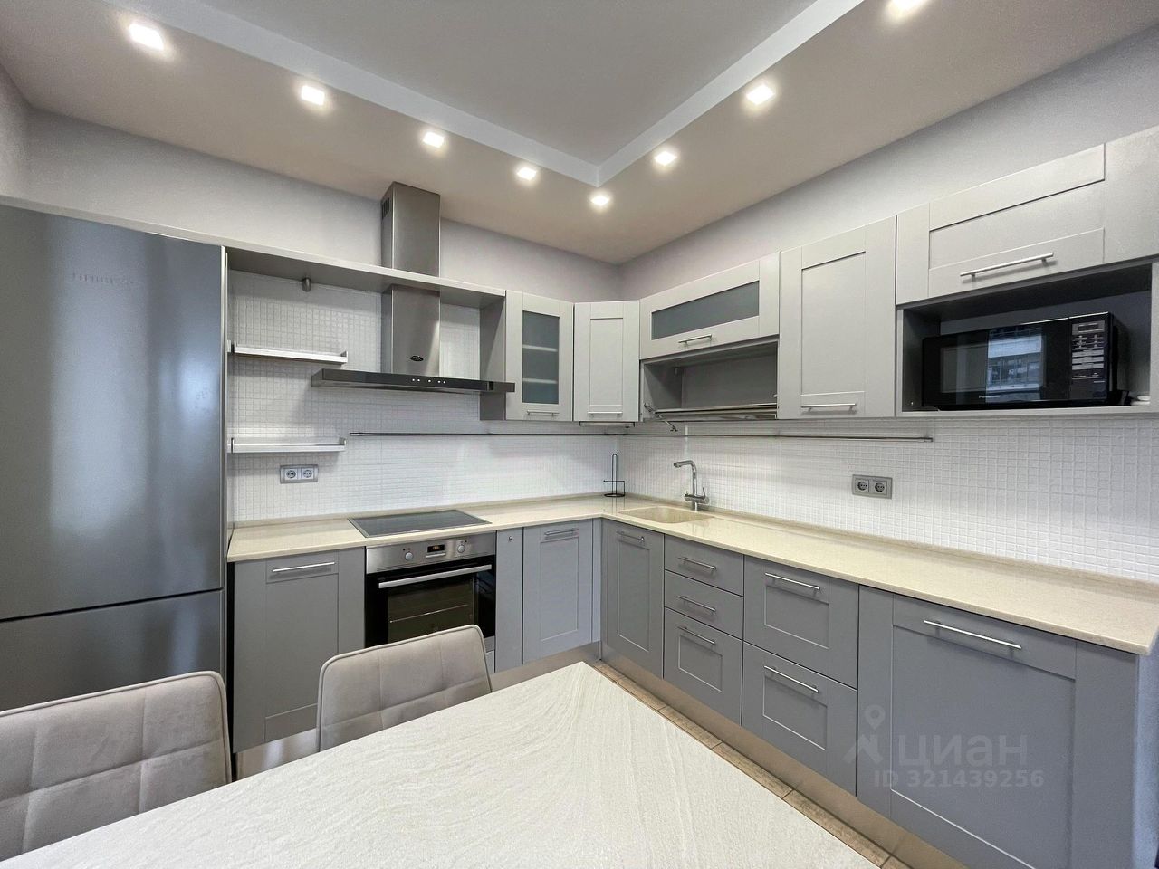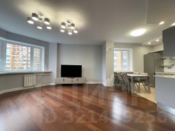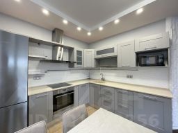 Кухня-гостиная: встроенный кухонный гарнитур, варочная панель индукция Bosch, вытяжка, холодильник Liebherr, духовой шкаф Electrolux, посудомоечная машина Neff, СВЧ Panasonic, система очистки воды (обратный осмос), подогрев пола, угловой раскладной диван, обеденный стол со стульями, кондиционер, телевизор, паркет из дерева мербау.