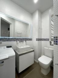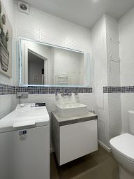 Гостевой санузел укомплектован: стиральной машиной Electrolux, раковиной с подвесным шкафчиком, зеркалом с подсветкой.
