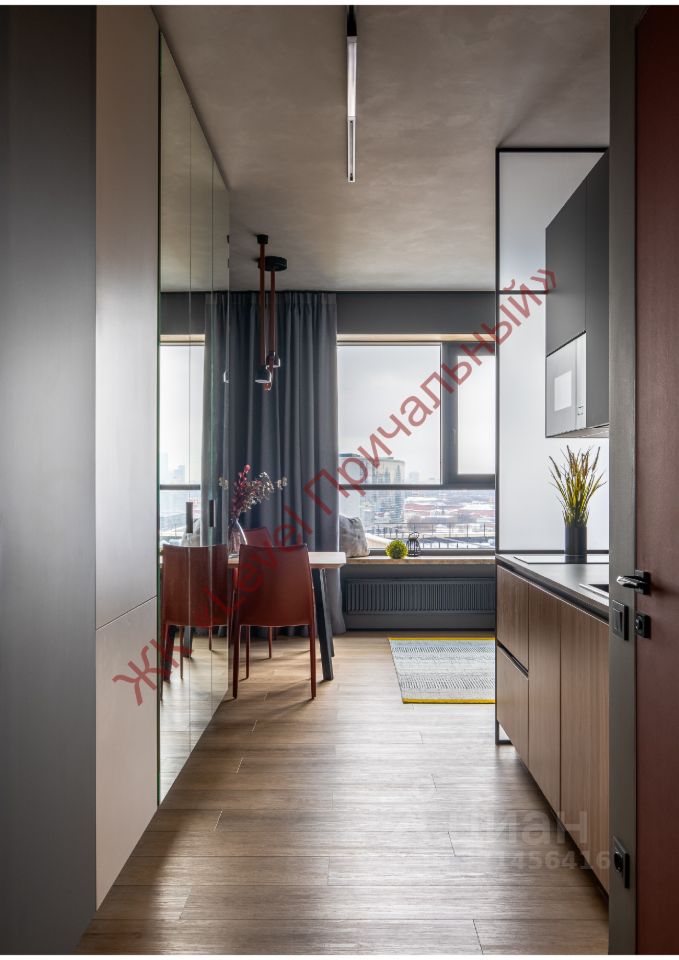 За счет зеркальных фасадов шкафа и стеклянного фартука удалось сильно расширить пространство.
