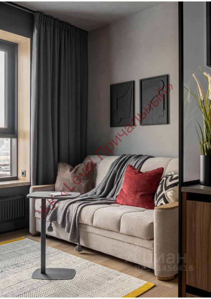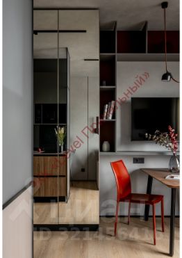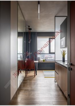 Было четкое представление Отделка бетон, хорошее рабочее место и яркие акценты. Планировка от застройщика предлагала большую комнату, совмещенную с кухней и спальным местом. Нам пришла идея сделать кухню в проходной части квартиры и организовать еще нишу между санузлом и комнатой, где разместилось комфортное рабочее место.