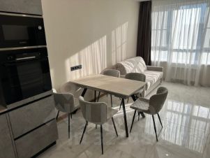 В квартире - только закончен качественный ЕВРО ремонт, из дорогих материалов- ПЕРВАЯ СДАЧА . На кухне встроенный гарнитур, вся бытовая техника Бош ( посудомоечная, варочная панель,духовой шкаф, свч, кондиционер, холодильник, отдельная марозильная камера ) .