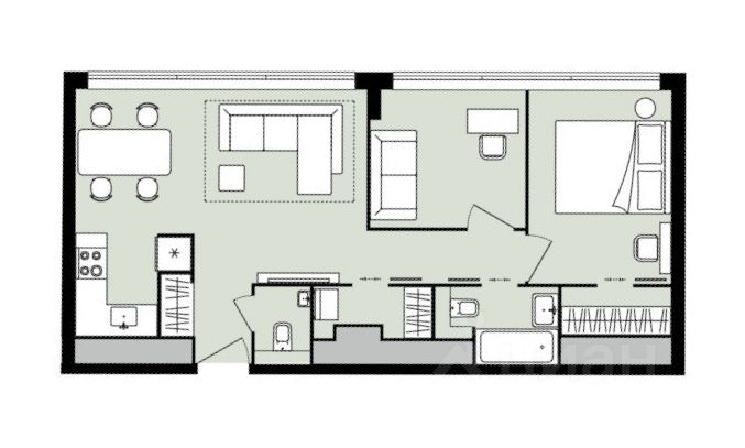 Планировка: 2 комнаты + гостиная с кухней, гардеробная, кладовка, с/у c ванной, гостевой с/у
