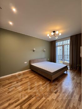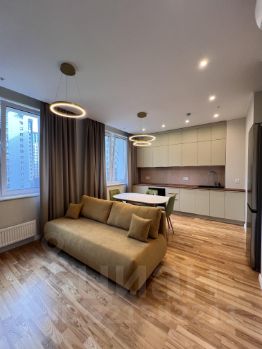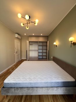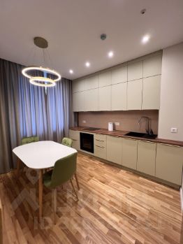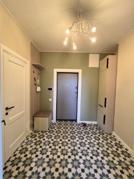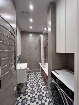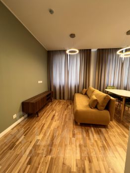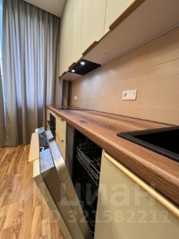 В квартире одна спальня и просторная кухня-гостиная. На кухне есть вся необходимая техника: варочная панель и духовой шкаф, посудомоечная машина. В санузле стиральная машина с сушкой.