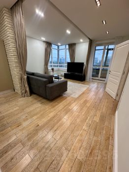 Просторная и стильная квартира с дизайнерским ремонтом и панорамным остеклением.