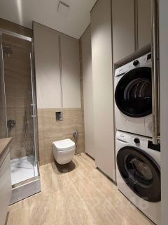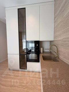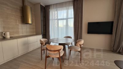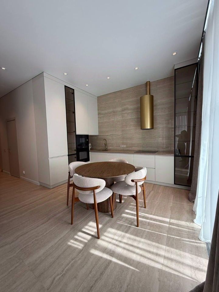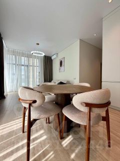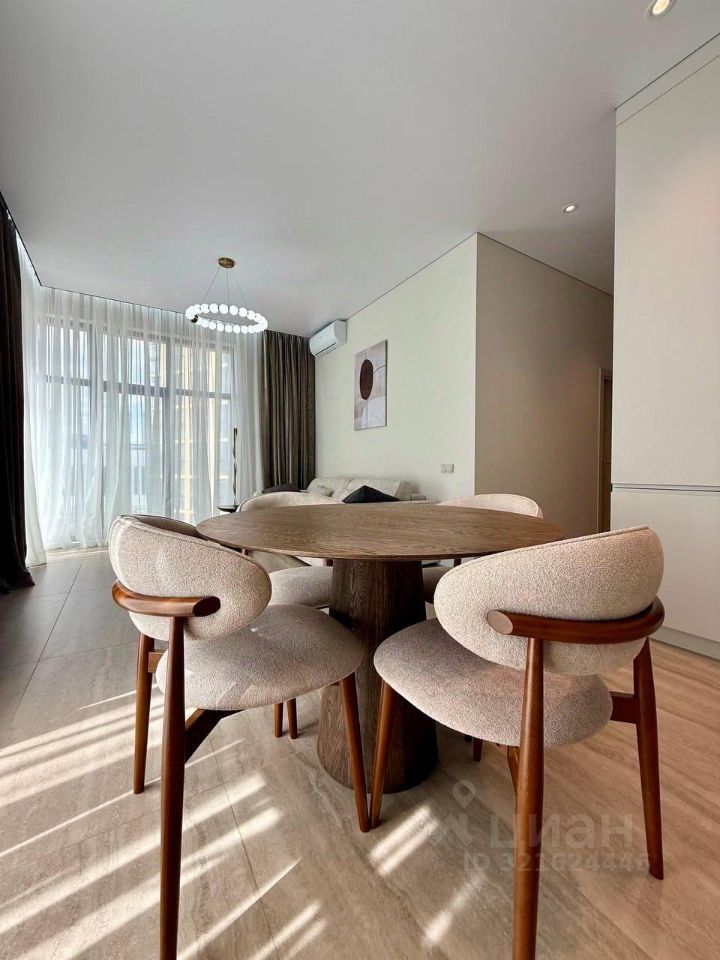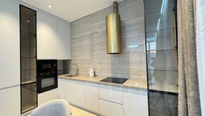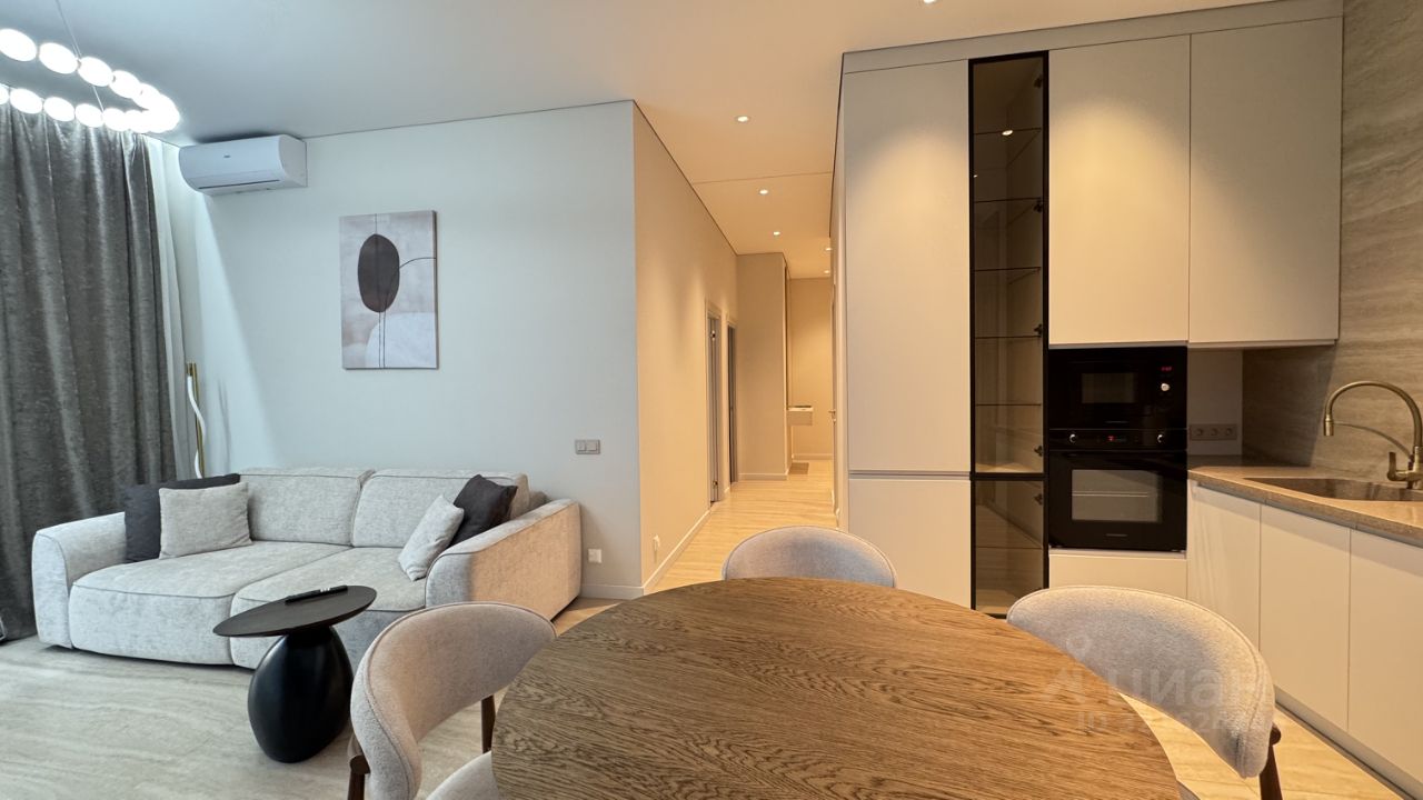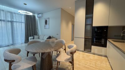 Квартира выполнена в дизайнерском стиле, что создаёт атмосферу уюта и современности. В просторной кухне есть вся необходимая мебель и техника: холодильник, посудомоечная машина и духовка, вытяжка, плита, посуда. В комнатах установлены кондиционер и телевизор, обеспечивая комфортное проживание. Ванная комната оборудована душевой кабиной. есть стиральная машина и сушильная машина. В квартире продуманы места хранения . Окна панорамные, французский балкон выходит во двор, что гарантирует тишину и спокойствие.