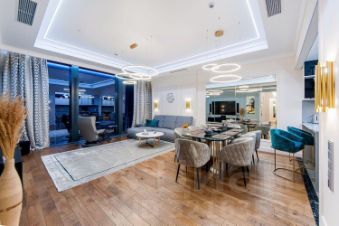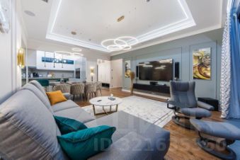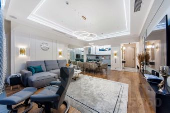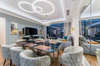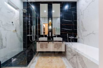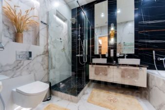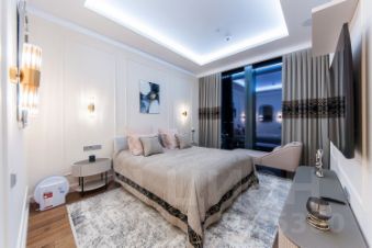 Дизайнерский ремонт выполнен с использованием премиальных материалов и передовых технологий в стиле современной американской классики. Есть вся бытовая техника от лучших производителей: стиральная, посудомоечная машины, TV, климат-контроль. Ванные комнаты оборудована сантехникой от мировых брендов. Панорамное остекление открывает захватывающие виды на столицу. Апартаменты оборудованы системой умный дом.