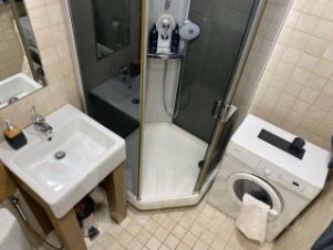 Санузел совмещенный, с душевой кабиной и стиральной машиной.
