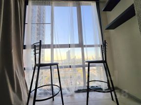 Лаундж зона на балконе с панорамными видами на закат, теплым полом и местом для отдыха.